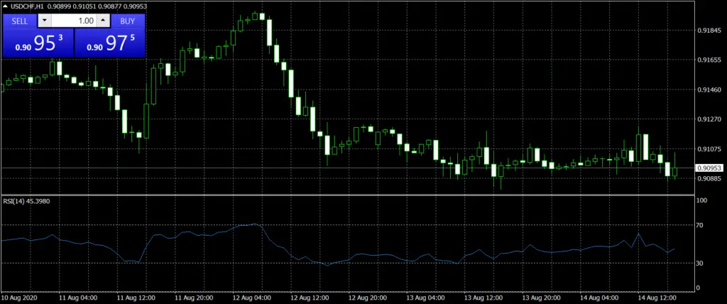 The RSI indicator on MT4 helps you establish the relative strength of recent price movements. It is often used to identify when a trend loses momentum and slows down. For example, if the RSI is set to 14 periods, and it is above 70, this shows the price has been rising over the last 14 periods.